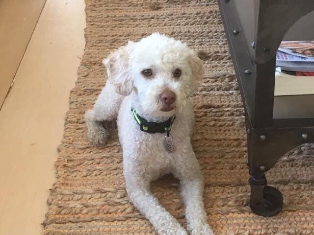 Marty, who is microchipped, is three years old. He is a small white poodle mix with a long tail. He has amber eyes, a few light brown patches —and he weighs about 13 or 14 pounds.
