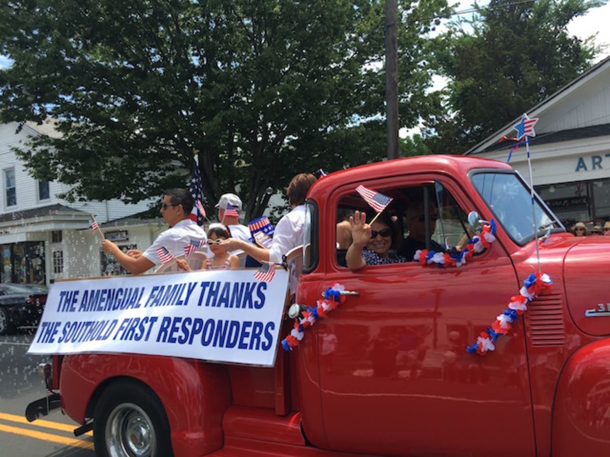 SOUTHOLD, NY — The float was perhaps one of the most meaningful in Saturday's July 4 parade in Southold: The festive, bright red truck had a large banner from the Amengual family thanking Southold first responders — and it was a message straight from the heart.