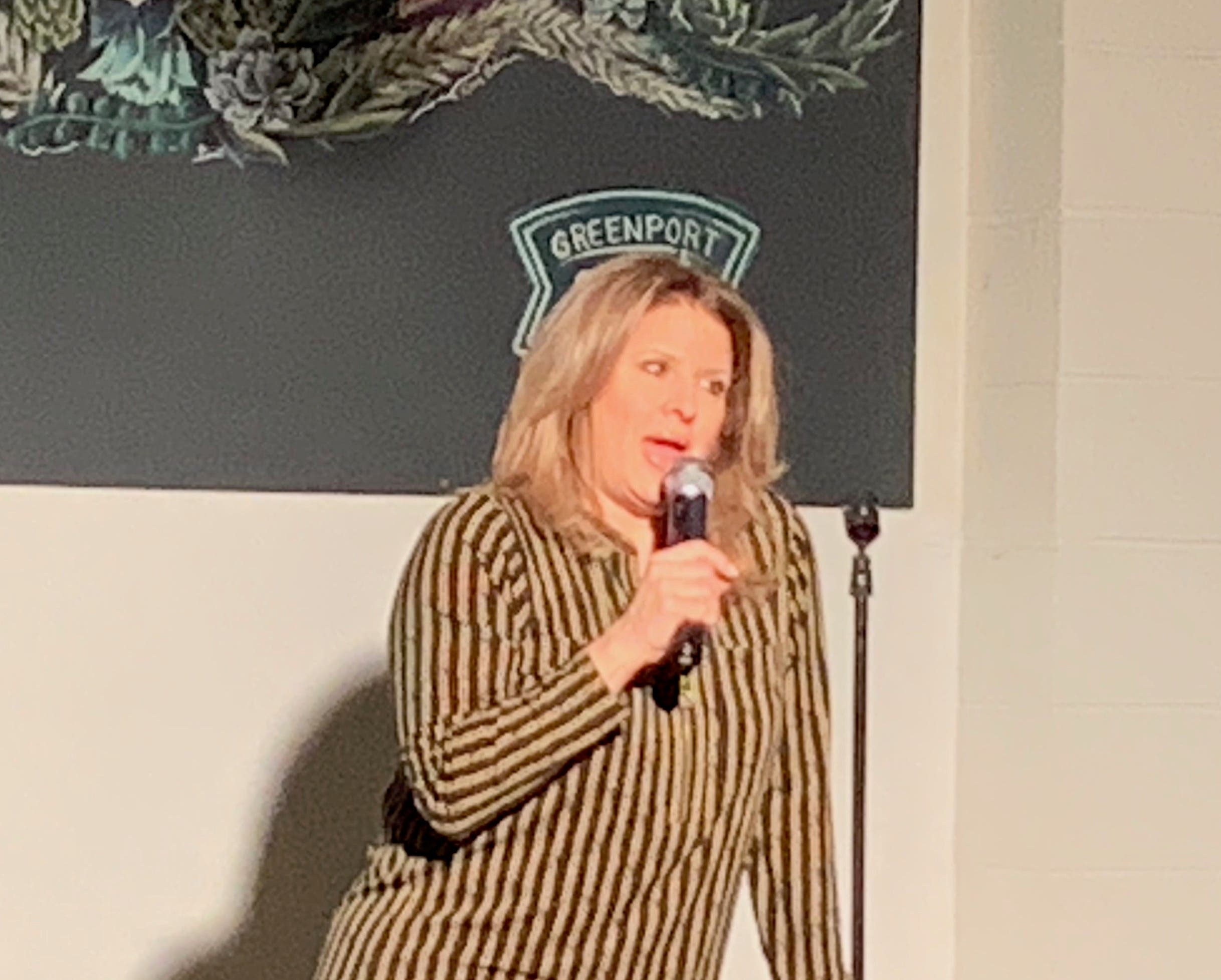 NORTH FORK, NY — At a recent comedy night at the Greenport Harbor Brewery in Peconic, comedian Carie Karavas had the audience roaring as she riffed on the travails faced by a woman in her 50s — weight gain, menopause and that moment when marriage shifts from the the first blush of passionate make-out sessions to wondering if her fat, hairy hubby has brushed his teeth.