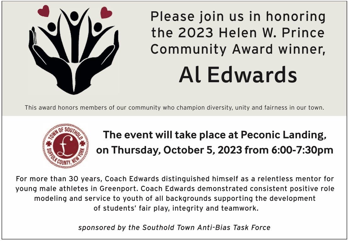 The Southold Town Anti-Bias Task Force will award Coach Al Edwards with the 2023 Helen W. Prince Award. The event will take place Thursday, October 5, from 6 p.m. to 7:30 p.m. at Peconic Landing, located at 1500 Brecknock Road in Greenport.