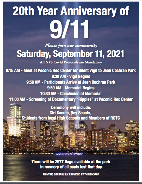 The memorial event will take place on Saturday, September 11, at Jean Cochran Park, located on Peconic Lane in Peconic. Participants are invited to arrive at 9:15 a.m. at the Southold Town Recreation Center, located at 970 Peconic Lane in Peconic, then join in a walk to the park.