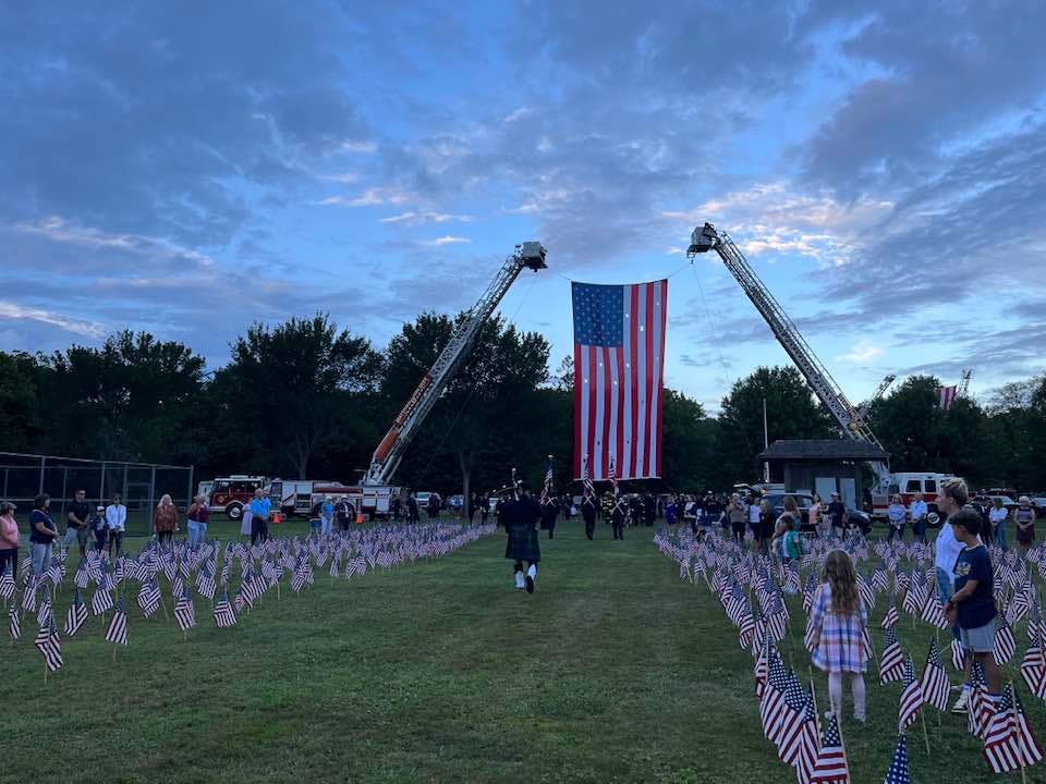 NORTH FORK, NY — A crowd gathered Monday night at Cochran Park in Peconic to place flags and pay solemn tribute to those who lost their lives on 9/11, 22 years ago.