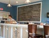 The walls are painted a vivid blue, and handmade wooden tables evoke the colors and feel of sandy shores. Bright whites and sage greens complement the pendant lights that illuminate a long, whitewashed wood counter near the front.