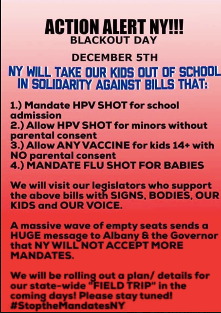 "New York parents: pull your children out of school on Thursday, December 5," the alliance wrote on Facebook. "Their absence will send a strong message to NY legislators that should these mandates pass people will not comply."