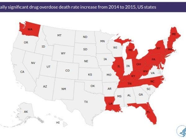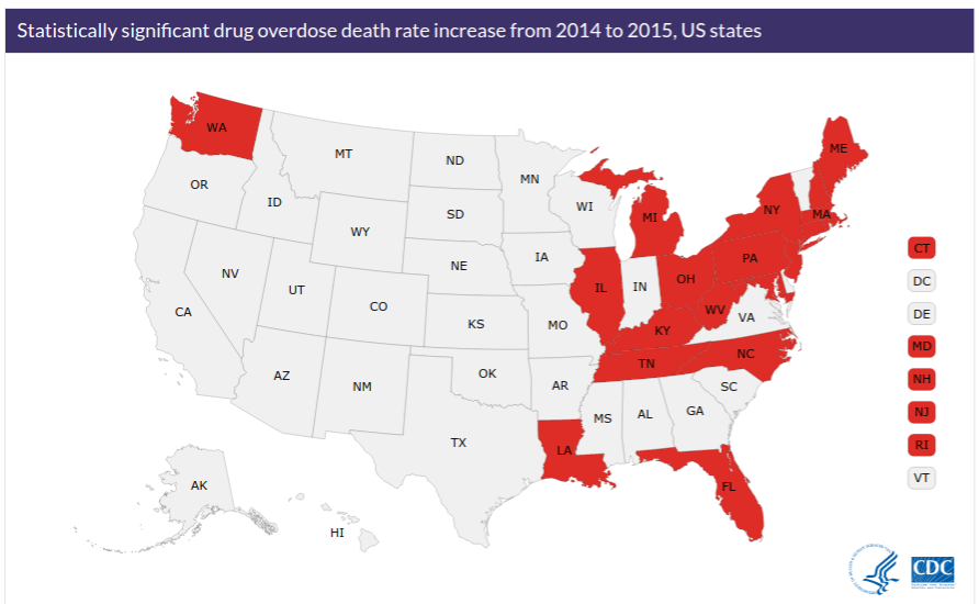 Other states with statistically significant increases in drug overdose death rates from 2014 to 2015 included Connecticut, Florida, Illinois, Kentucky, Louisiana, Maine, Maryland, Massachusetts, Michigan, New Hampshire, New Jersey, North Carolina, Ohio, Pennsylvania, Rhode Island, Tennessee, Washington and West Virginia.