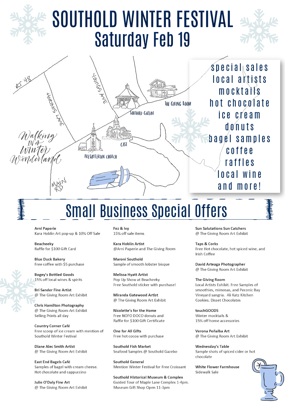 "The Festival is a wonderful collaboration of over 40 small businesses and not-for-profits including Community Action of Southold Town and the Southold Historical Society," DiDonato said. A number of local artists will be featured at The Giving Room and local businesses are offering special sales, free samples and unique experiences.