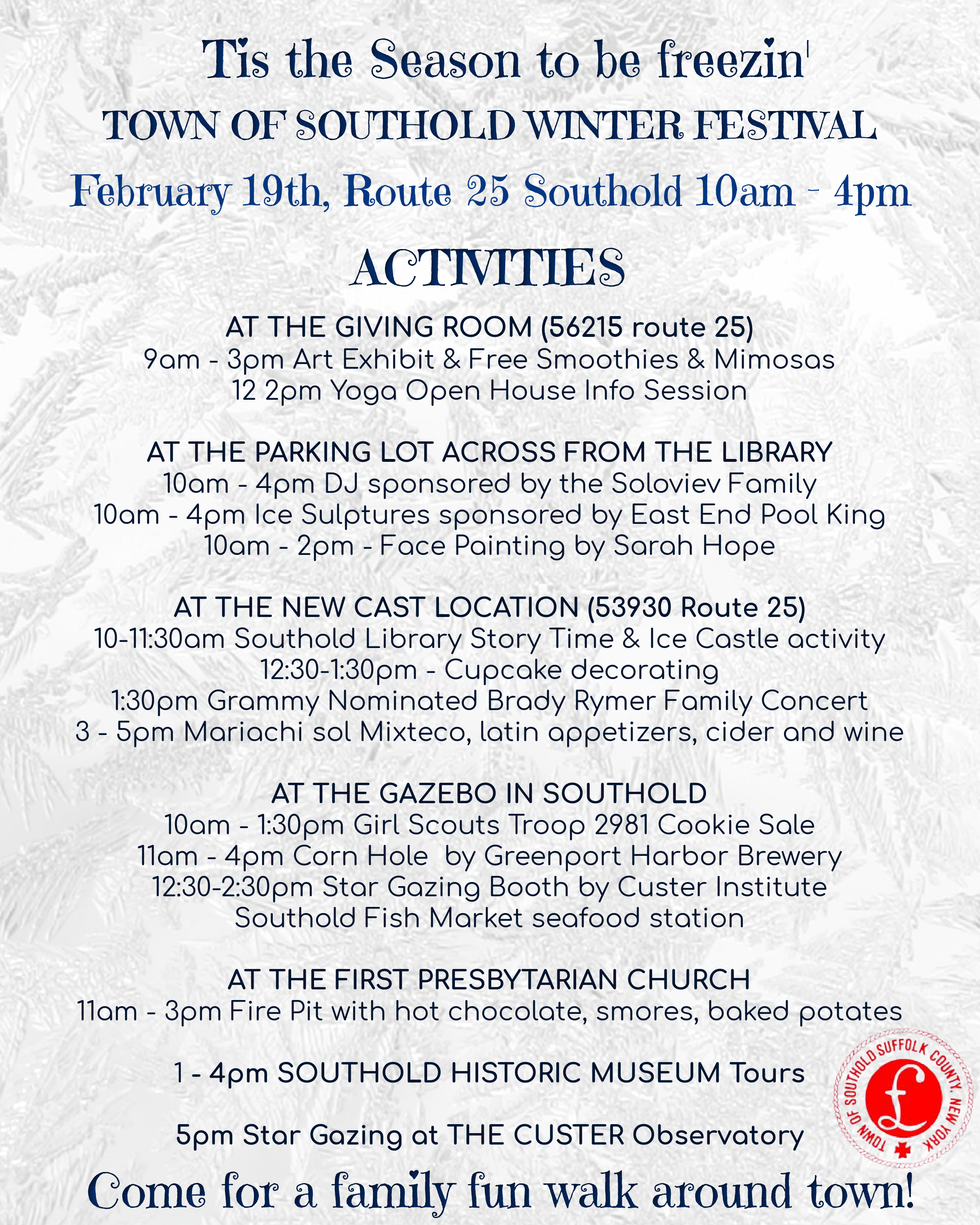 SOUTHOLD, NY — Downtown Southold will come alive Saturday with the First Annual Southold Winter Festival, which will offer an array of fun activities for all, including ice carving, music, food, a fire pit, and an art exhibit.