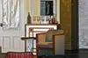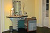 The modest set consists of a dressing table, mirror and chair on one side and a small bar and chair on the other.