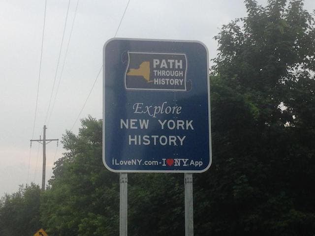 The signs in Orient are part of the state's "Path Through History" initiative, urging guests to "Explore New York History" and visit ILoveNY.com or utilize an app for information.