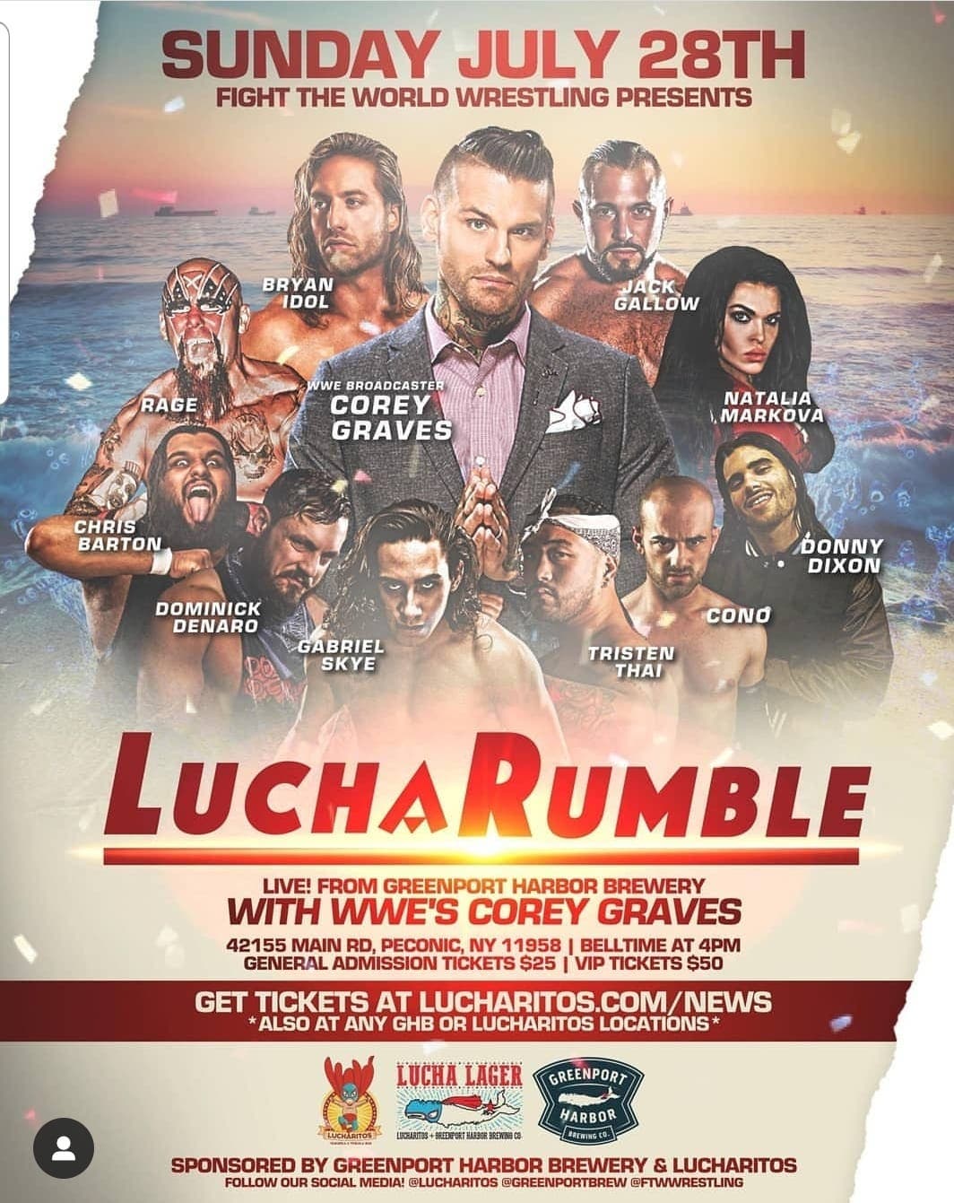 The Lucharitos taco truck will be onsite featuring some special LuchaRumble eats including the brand new Ric Flair taco; Greenport Harbor Brewing Co. will be serving Lucha Lager, a special collaboration with Lucharitos.