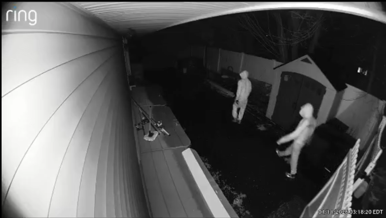 Surveillance images released by police show two individuals wearing hooded sweatshirts in the driveway area near the home during the overnight hours.