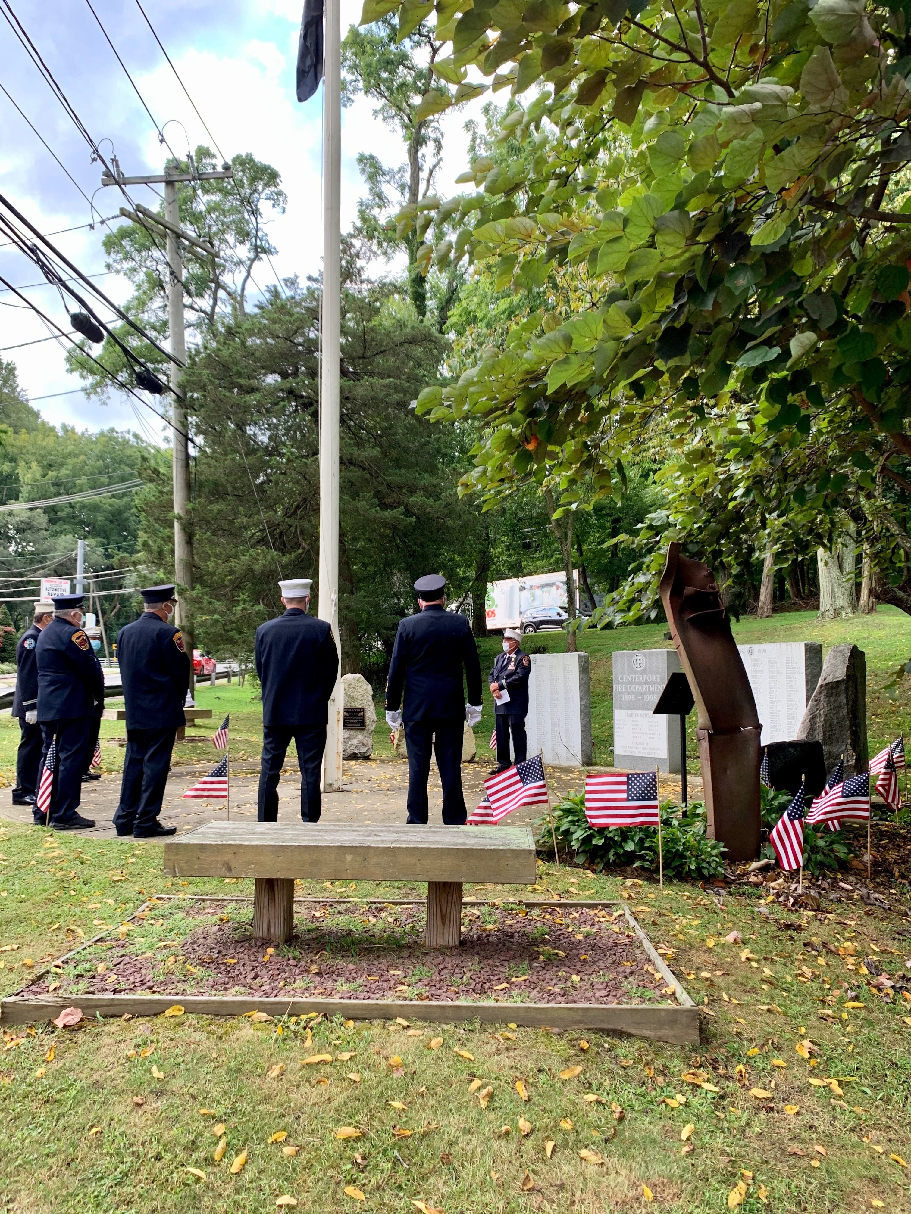 Centerport firefighters were joined by retired members of the F.D.N.Y. in honoring the victims and those who have subsequently perished due to 9/11-related illnesses, according to public information officer Steve Silverman. The service was held at the memorial monument on Park Circle that contains a steel I-Beam from the World Trade Center. The bell in front of the firehouse was rung in memory of all those who died.