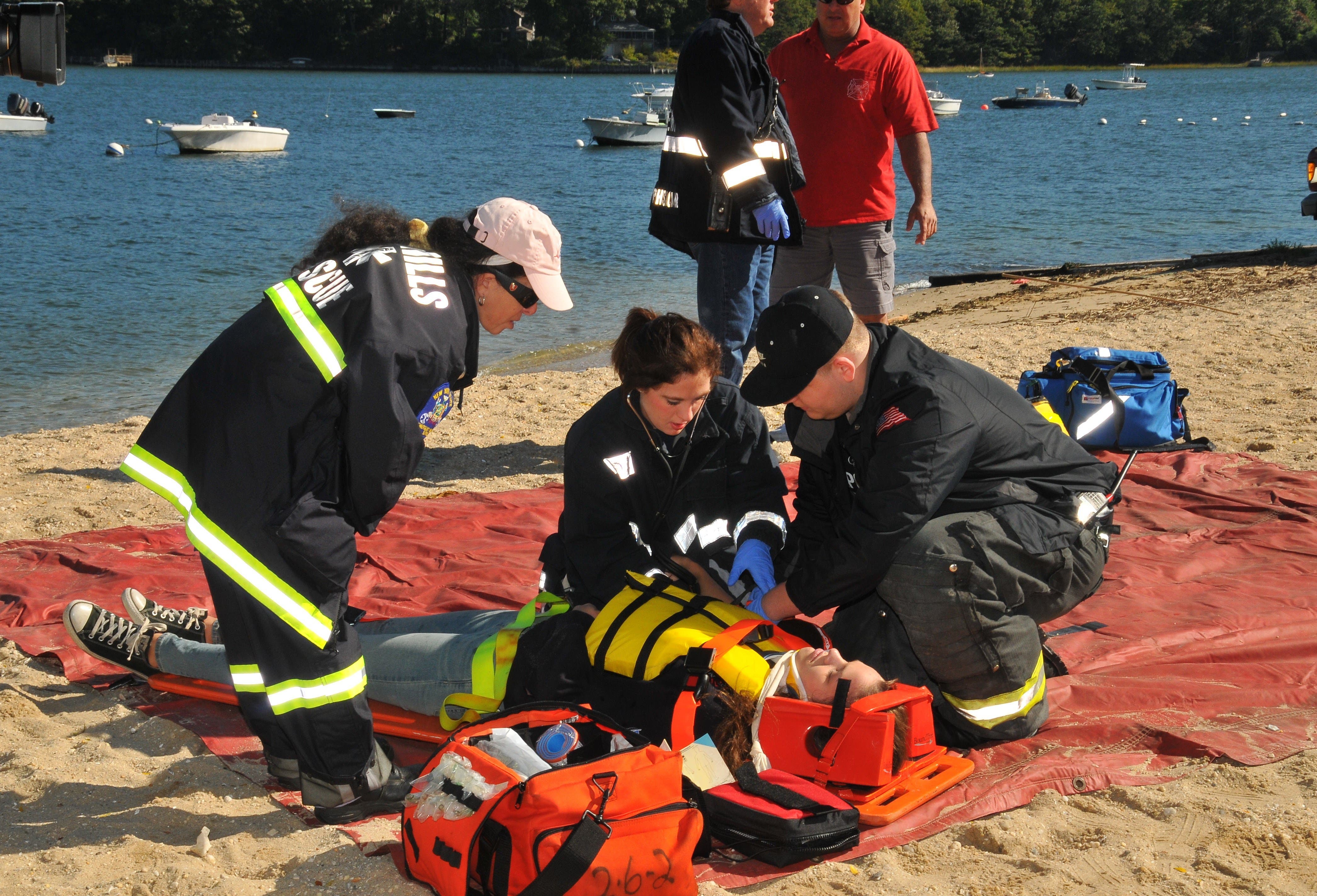 Boats from various agencies rescued the victims who were portrayed by junior fire and EMS from Northport, Greenlawn and Huntington Community. The simulated patients were transported to designated docks at the Huntington Beach Community Association in Centerport, and the Bay Club in Halesite.