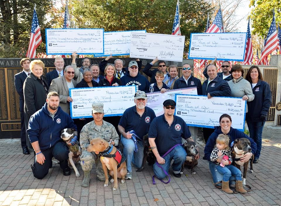 Cow Harbor Warriors, a veteran organization that honors and enables post 9/11 wounded veterans and veterans in need, handed checks to The Semper Fi Fund, The Disabled American Veterans Transportation Network, Paws of Wars and the Northport VA Medical Center.