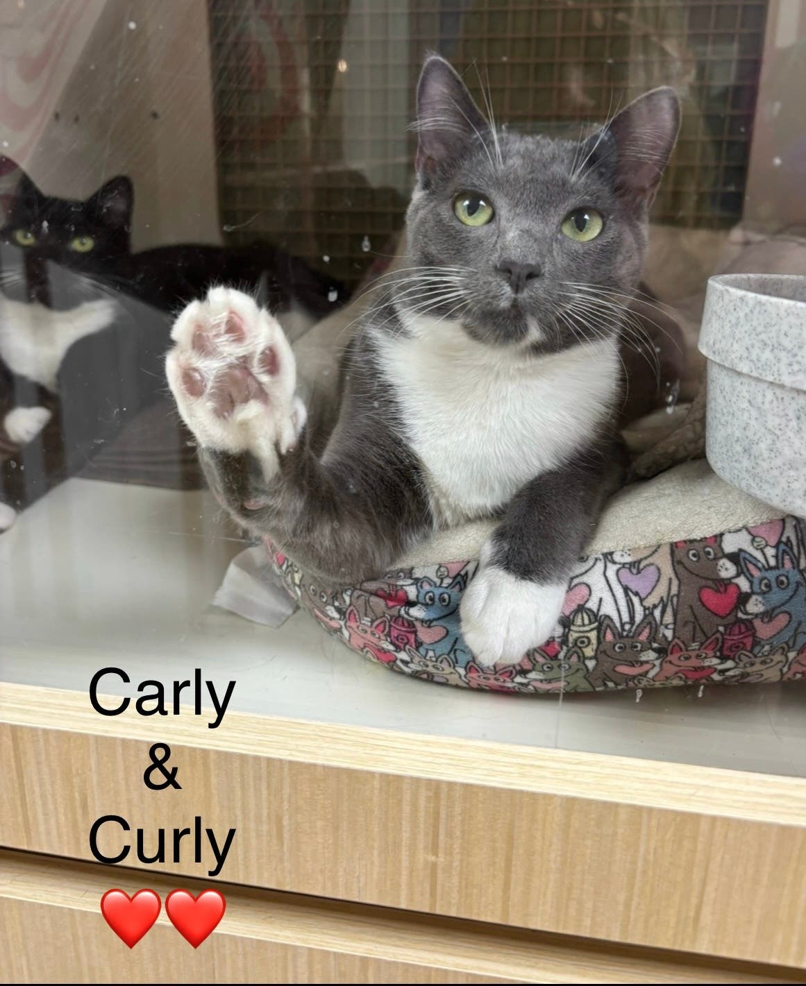The rescue said it recognizes that trying to adopt a pair can be more difficult financially and doesn't want cost to be the reason two cats are not adopted together, so it is giving a 25% discounted adoption fee for Carly and Curly to be adopted together.