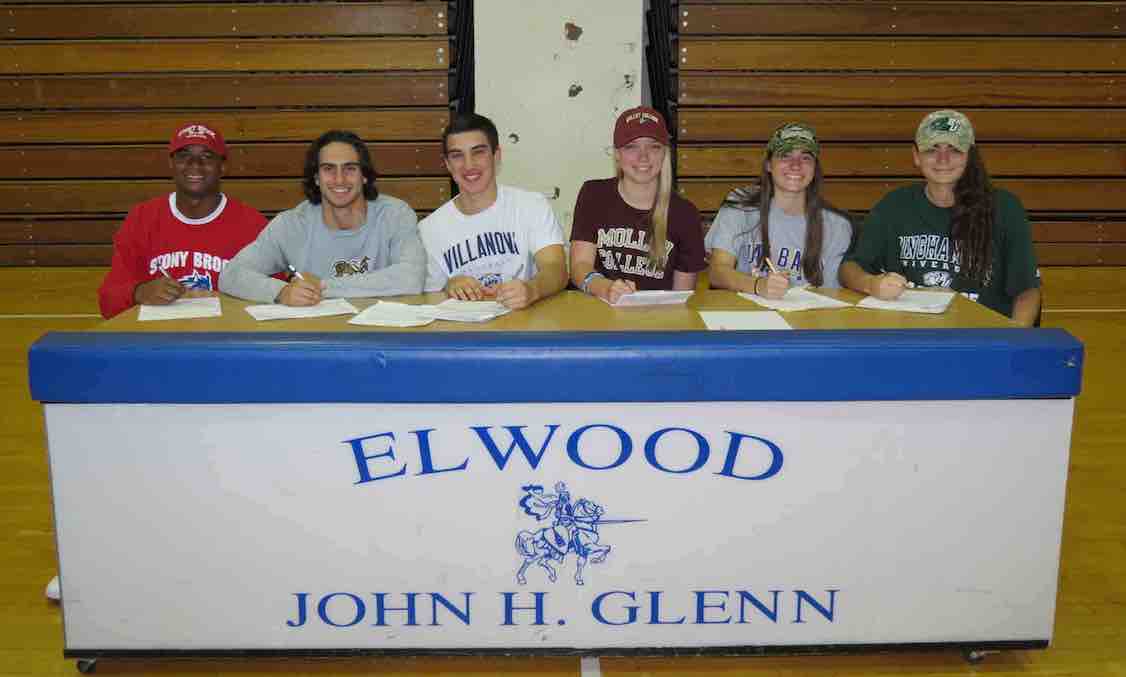 Photo courtesy of the Elwood Union Free School District: Elwood-John H. Glenn High School student-athletes signing National Letters of Intent from left Wayne White, Chris Forsberg, Tyler Arella, Nora Miller, Victoria Tsangaris and Amelia Biancardi.