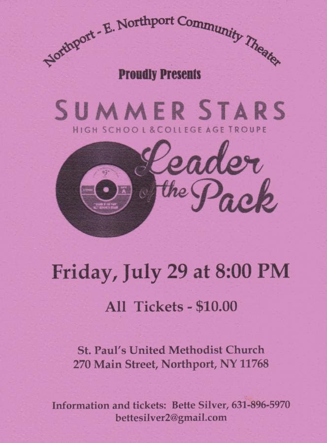 Northport Community Theater's SUMMER STARS (high school/college-age theater troupe) present the musical LEADER OF THE PACK at St. Paul's in Northport on July 29 @ 8