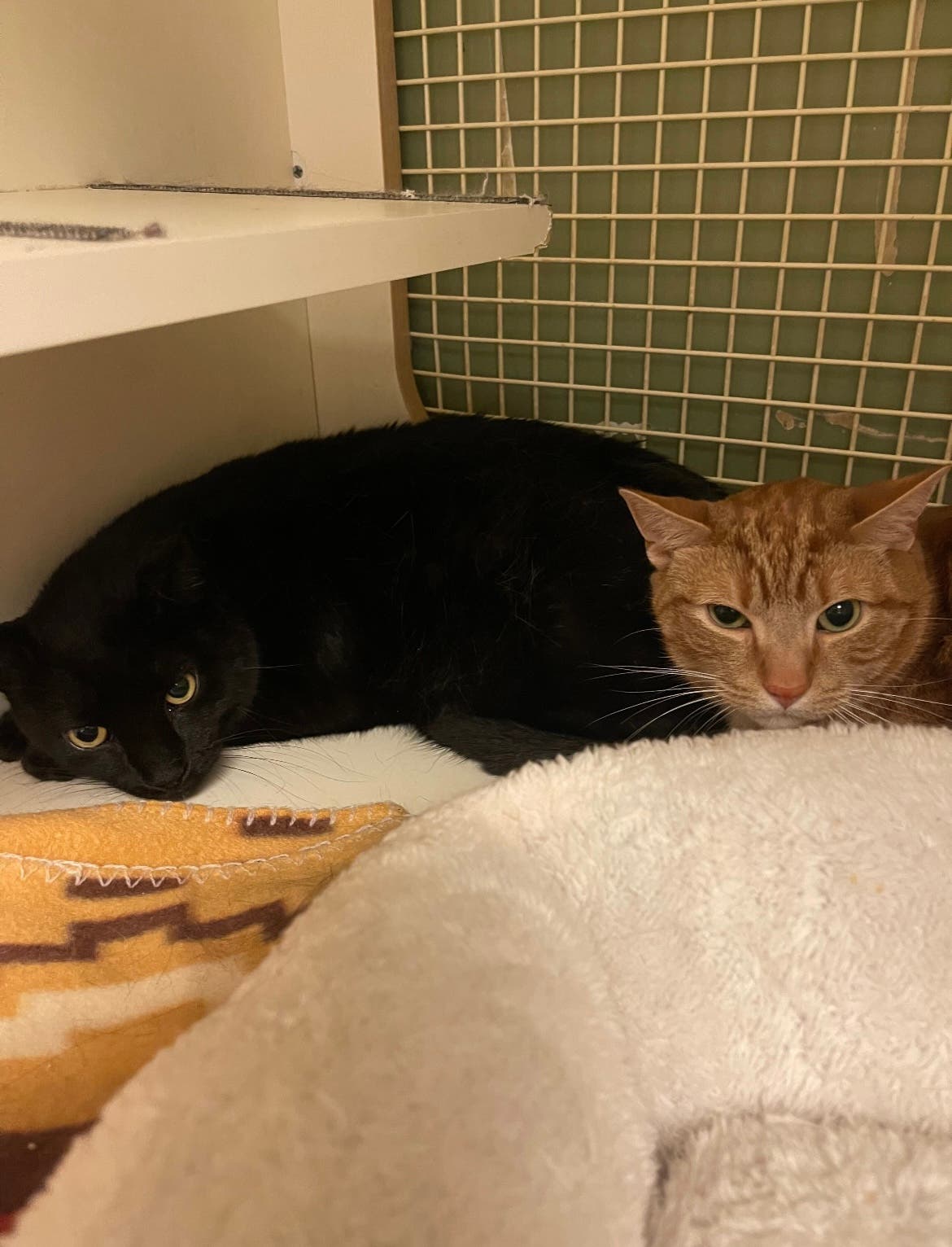 Ollie is an orange tabby, around 4 years old, and Hercules is a velvety black cat around 6 years old.
