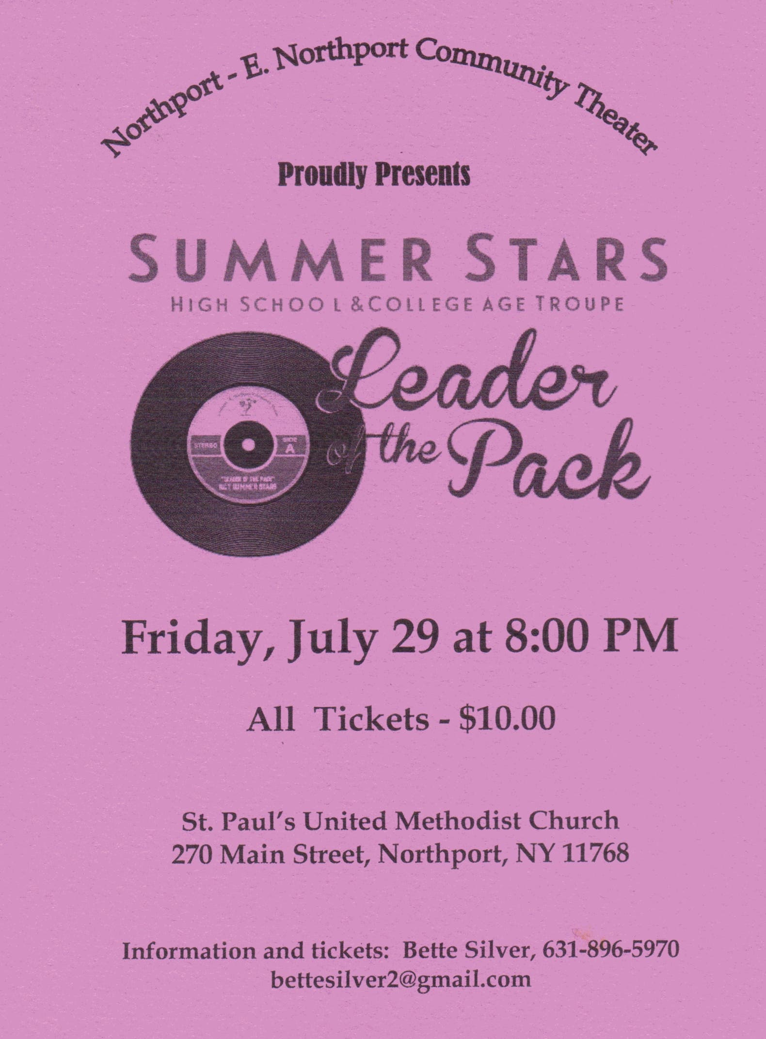 Northport Community Theater's SUMMER STARS present the musical LEADER OF THE PACK at St. Paul's in Northport on July 29 @ 8
