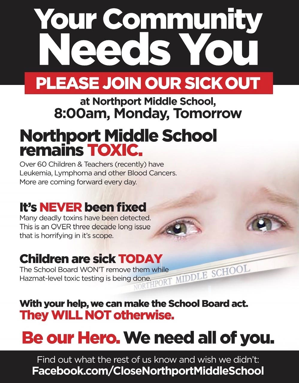 The "Sick Out" is being organized by Close Northport Middle School Long Island, New York, a Facebook group aiming to educate the community about the potential health risks at the school.