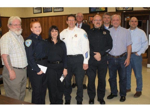 Image via Northport Police: Northport Police Officers Devin Humphreys and Steven Golub and Dispatcher Dana Gunther receive commendations from the Northport Village Board of Trustees and Northport Chief of Police Bill Ricca for their part in saving a new born baby on January 14, 2017.