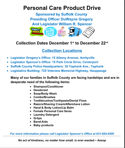 The nearest drop-off center is at Leg. William Spencer’s office at 15 Park Circle Drive in Centerport.