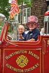 - Huntington Manor firefighter Fred Steenson, Sr., with his patriotic hat with Deacon Ed Billia in antique fire engine.