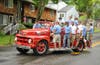 - Firefighters ride on antique Northport Fire Department truck.