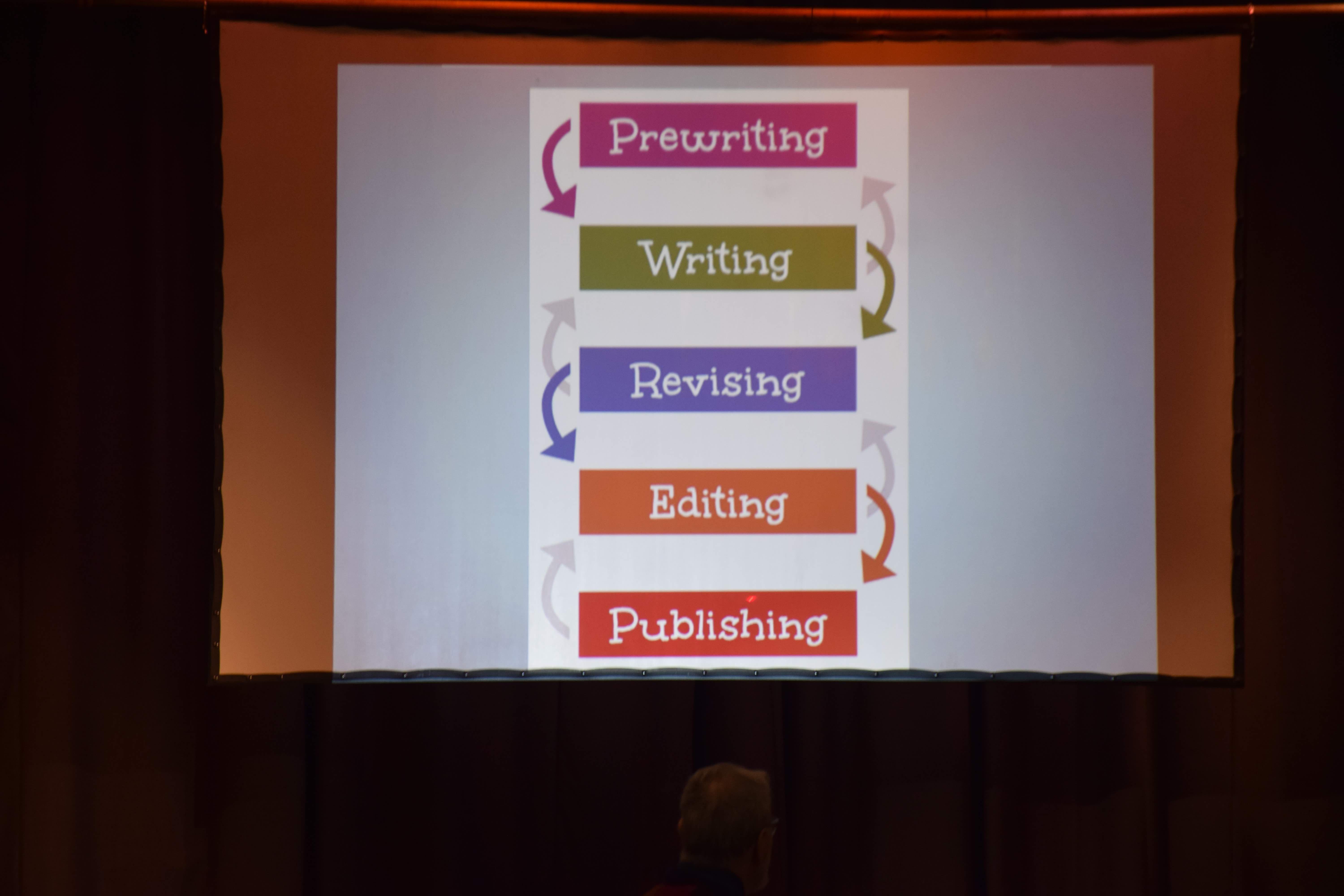 For the students to become the best readers and writers, Strasser explained the writing process that he used to write his books, "Help, I’m Trapped in my Principal’s Body," and "Fallout" – a recollection of his experiences as a child during the Cold War. The process includes pre-writing, or brainstorming, writing, revising, editing and then publishing.