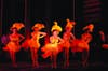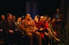 During the daytime scenes, the screens sport black and white photographic murals of old New York, stark backdrops which highlight actors' colorful pin-striped suits and actresses' jewel-toned dresses. On their flip side, the panels broadcast in orange and yellow a montage of company names that were the icons of the fifties—Coca Cola, the Astor, the Orpheum—Koch’s fitting visual commentary on “electric, neon, sexy underworld” that was Runyon’s Manhattan at night. This effect is stunning and reaches its apex in the scenes that take place at the Hot Box nightclub.
