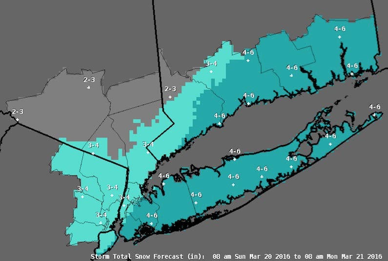 "Much of this event is expected to be snow," the NWS said in a forecast discussion released Friday night. "Bulk of it Sunday afternoon through Sunday evening. Snow amounts are 4 to 6 inches to the east of NYC and less than that to the north and west."