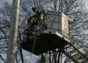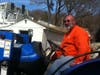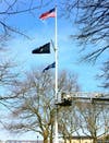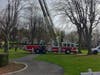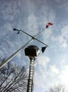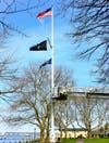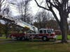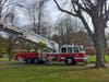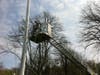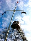 Forster borrowed a ladder truck from the to untangle the Prisoners of War/MIA flag that is also on the pole along with the New York State flag when he noticed the spotlight was out and he decided to take advantage of the machinery present. Drew operated the truck. Both are volunteer members of the department.