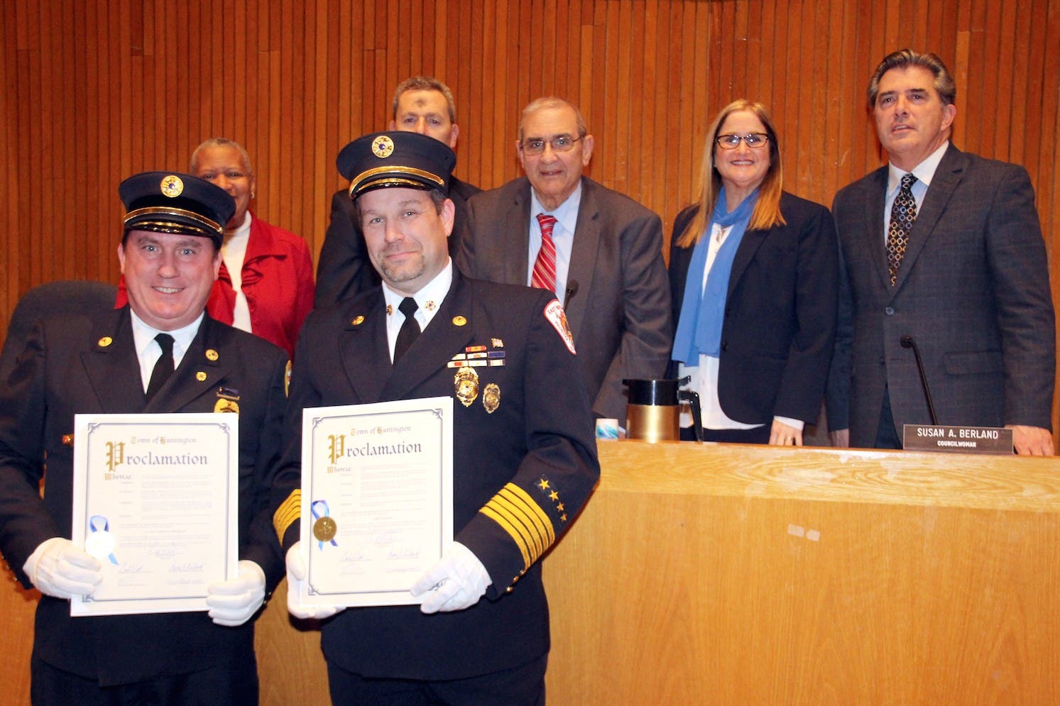 Photo: Chief Dan McConnell (l), standing in for Chief Daniel Heffernan, and Chief Joseph Ervin (r) receive proclamations from the Town Board.