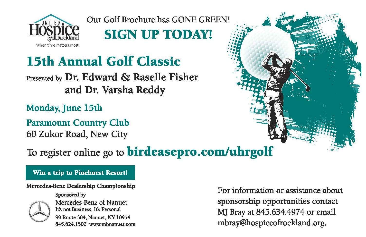 The fifteenth annual United Hospice of Rockland (UHR) Golf Classic presented by Dr. Edward and Raselle Fisher and Dr. Varsha Reddy will be held on Monday, June 15th starting at 9 am at the Paramount Country Club, 60 Zukor Road, New City. All proceeds from the Golf Classic directly benefit the mission of United Hospice of Rockland and help ensure our continued ability to provide comfort and care to individuals and their families in our community.