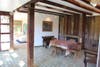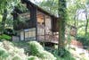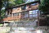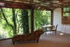The home is a very modest 2 bedroom, one bath two level home of unique character that hugs a hillside just off the main street of Stony Point. It is easily missed and it seems that it has been suspended in time. More tree house than farmhouse, its hand-hewn exposed timber beams and posts, rough tile floors and barn board walls, are touched by the creativity of a genius artist. Unique to the home are four large glass garage doors on the first and second levels that were installed at the request of Mr. Johns. Closed, these doors serve as massive windows onto the nature that surrounds the property. However, when the two large doors in the upper level studio open, it creates an indoor/outdoor space with unmatched light and serenity.