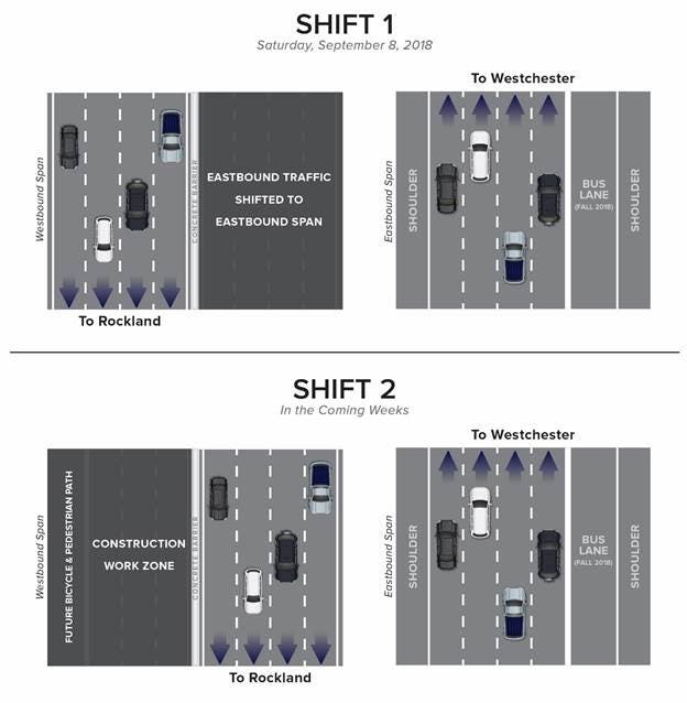 Rockland-bound motorists will continue to use the current four lanes on the westbound span. In the coming weeks, the four lanes of westbound traffic will be shifted to the opposite side of the span (where eastbound traffic used to be) to allow for construction of the bicycle and pedestrian path and its six overlooks.