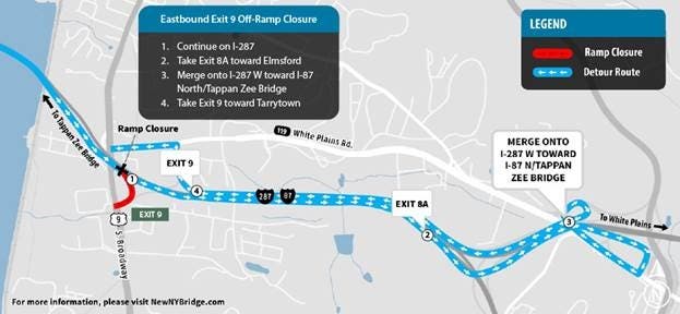 The southbound/eastbound Thruway exit 9 (Tarrytown – Sleepy Hollow – US Route 9) off-ramp will be closed at approximately 9:30 p.m.Southbound/eastbound drivers will be detoured to the exit 8A (Elmsford - NY Route 119 - Saw Mill River Parkway North ) shown below.