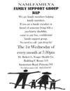 This free, confidential support group for family and friends who have a loved one living with a mental illness is sponsored by NAMI-FAMILYA of Rockland County, Inc. NAMI-FAMILYA is affiliated with the National Alliance on Mental Illness and NAMI-NYS. The support group is facilitated by trained family members who also have a loved one living with mental illness. The group is free and no registration is required. Call NAMI-FAMILYA at (845) 359-8787 for more information. Family members are welcome to drop-in at 7:30pm on the first Wednesday of every month.