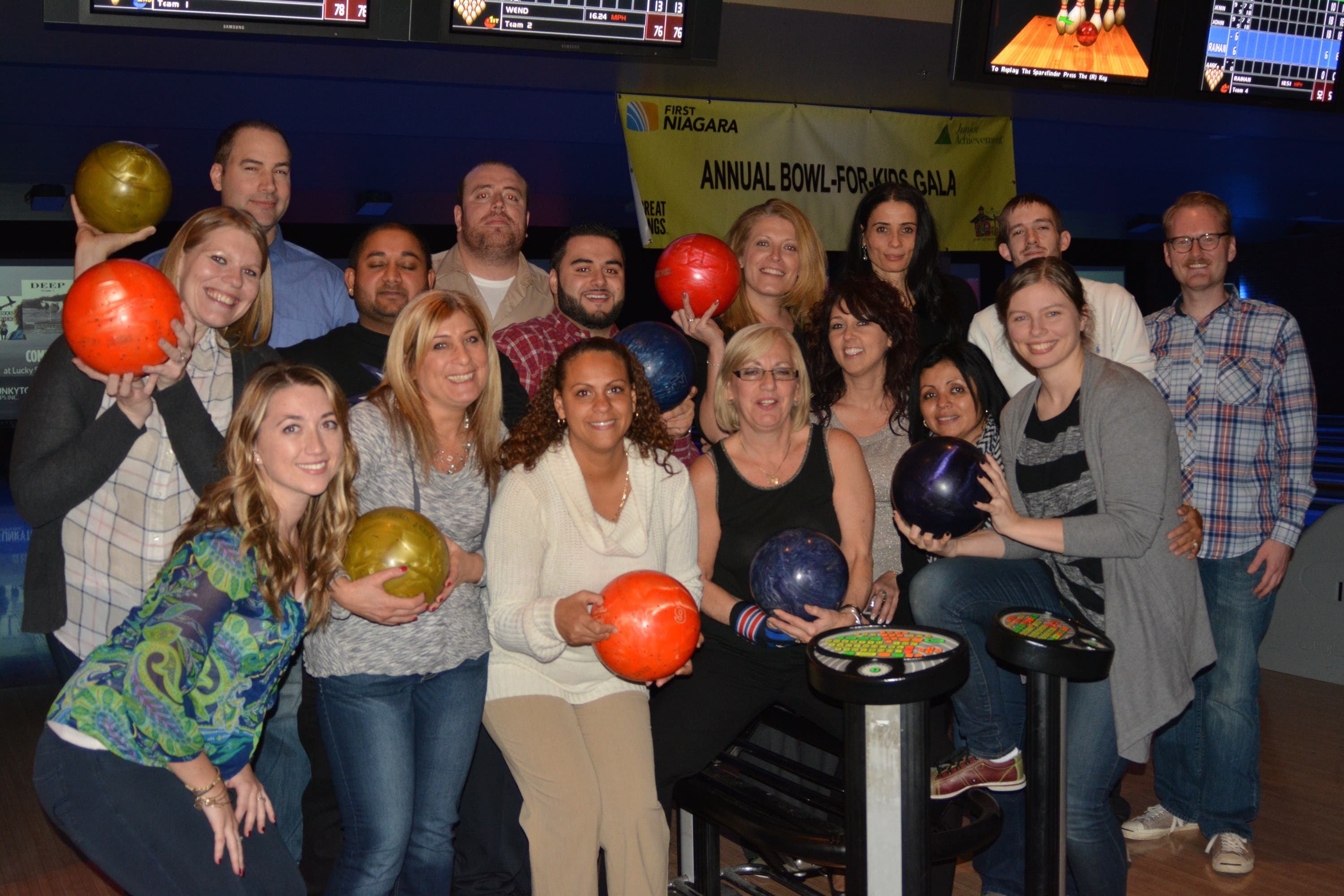 NYACK, NY (November 2014) – First Niagara announced today that employees in its Tri-State Region raised $10,528.75 in donations to benefit the Junior Achievement of the Hudson Valley (JAHV), an organization dedicated to educating students about workforce readiness, entrepreneurship and financial literacy through experiential, hands-on programs. First Niagara employees participated in a Bowl-For-Kids bowl-a-thon at Lucky Strike, Palisades Mall in West Nyack on November 20. Over 50 employees from the Lower Hudson West and Lower Hudson East branches solicited donations for Junior Achievement from family, friends and colleagues to participate.