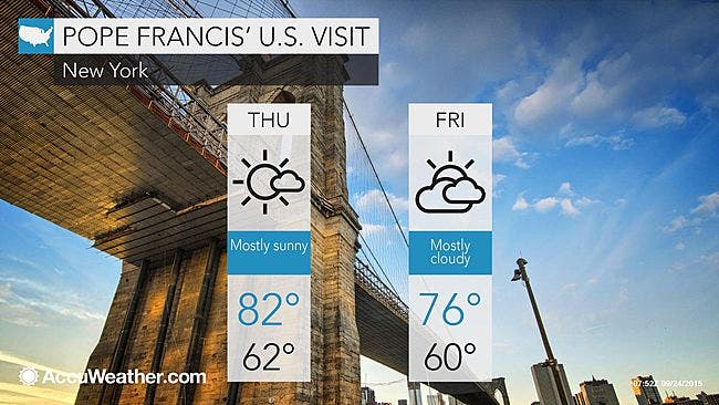 Then on Friday, his only full day in the city, temperatures should be in the middle to upper 70s as the Holy Father meets with the United Nations General Assembly, where he is expected to discuss his stance on climate change, tours the 9/11 Memorial and Museum, talks with children at Our Lady Queen of Angels School in East Harlem, visits Central Park and holds a Mass at Madison Square Garden.