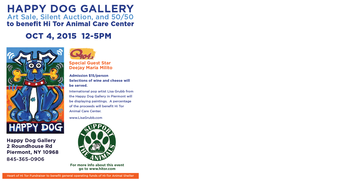HAPPY DOG GALLERY TO HOLD BENEFIT FOR THE HI TOR ANIMAL CARE CENTER, SUNDAY, OCT. 4, 12-5 pm