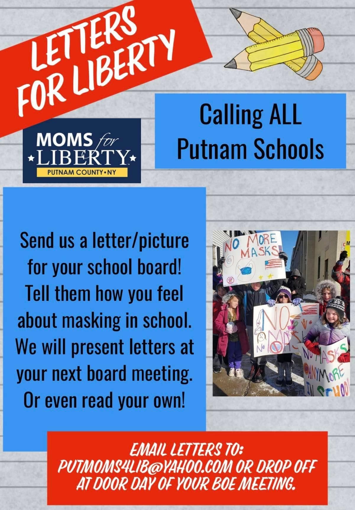 In Putnam County, Moms For Liberty has started a letter-writing campaign for kids to put pressure on school boards there, Harrigan said.