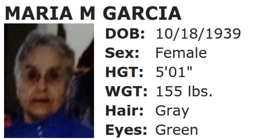Maria Garcia is a 76-year-old missing vulnerable adult with schizophrenia. She was last seen walking eastbound on State Route 300 in the town of Newburgh at 5AM Dec. 9.