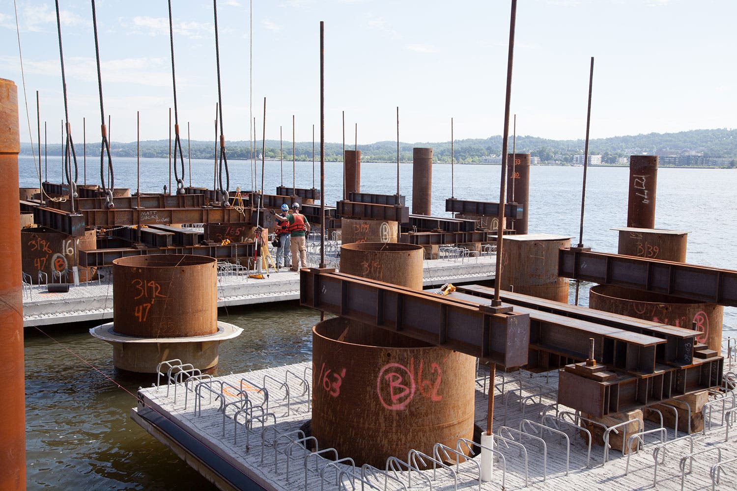 Construction of Pier 1 located near River Road in South Nyack is continuing with the installation of sheet piles. The sheet piles support the surrounding soil while the foundation for the new bridge pier is constructed.