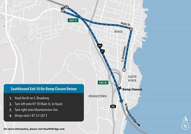 - Work will require a temporary closure of the Thruway (I-87/I-287) Exit 10 (Nyack - South Nyack - US Route 9W) southbound on-ramp from 8 p.m. until 7 a.m. Saturday. Southbound/eastbound drivers will be detoured to the exit 11 on-ramp, shown below.