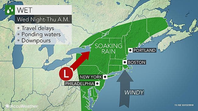 Rain is expected to get heavy Wednesday evening. Temperatures will soar, hitting about 55 at midnight before plunging into the 30s over the following 24 hours.