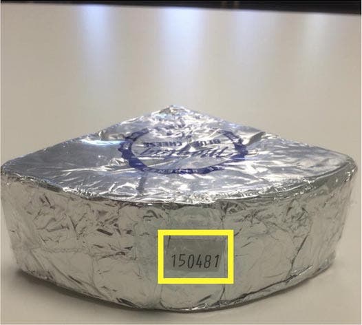 Photo caption: Maytag Dairy Farms blue cheese with lot number highlighted. Photo credit: FDA.