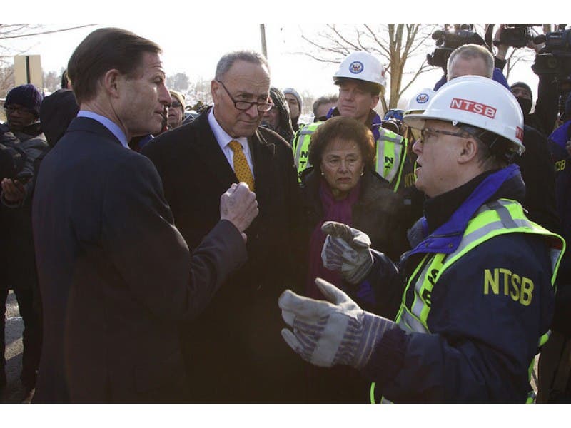 PHOTO: Schumer, Blumenthal and Reps. Nita Lowey and Sean Patrick Maloney toured the scene of the deadly Metro North train crash Feb. 6, 2015 with Robert Sumwalt of the National Transportation Safety Board/NTSB