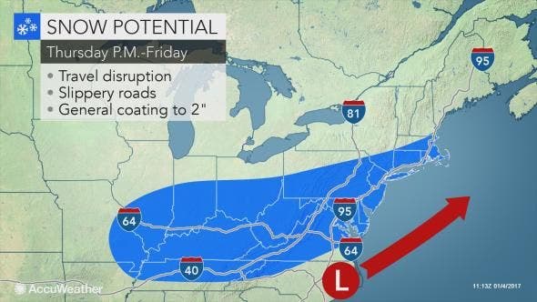 “The snow will fall during the predawn and morning hours on Friday from Boston to Washington,” AccuWeather Meteorologist Brian Thompson said. “While this certainly will not be a major snowfall, the timing of this covering of snow will make many roads slippery for the Friday morning commute."