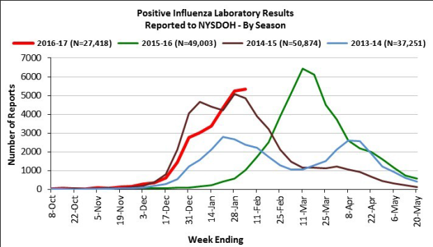 Out of the 62 counties in New York, 61 counties reported positive influenza tests over the past week.